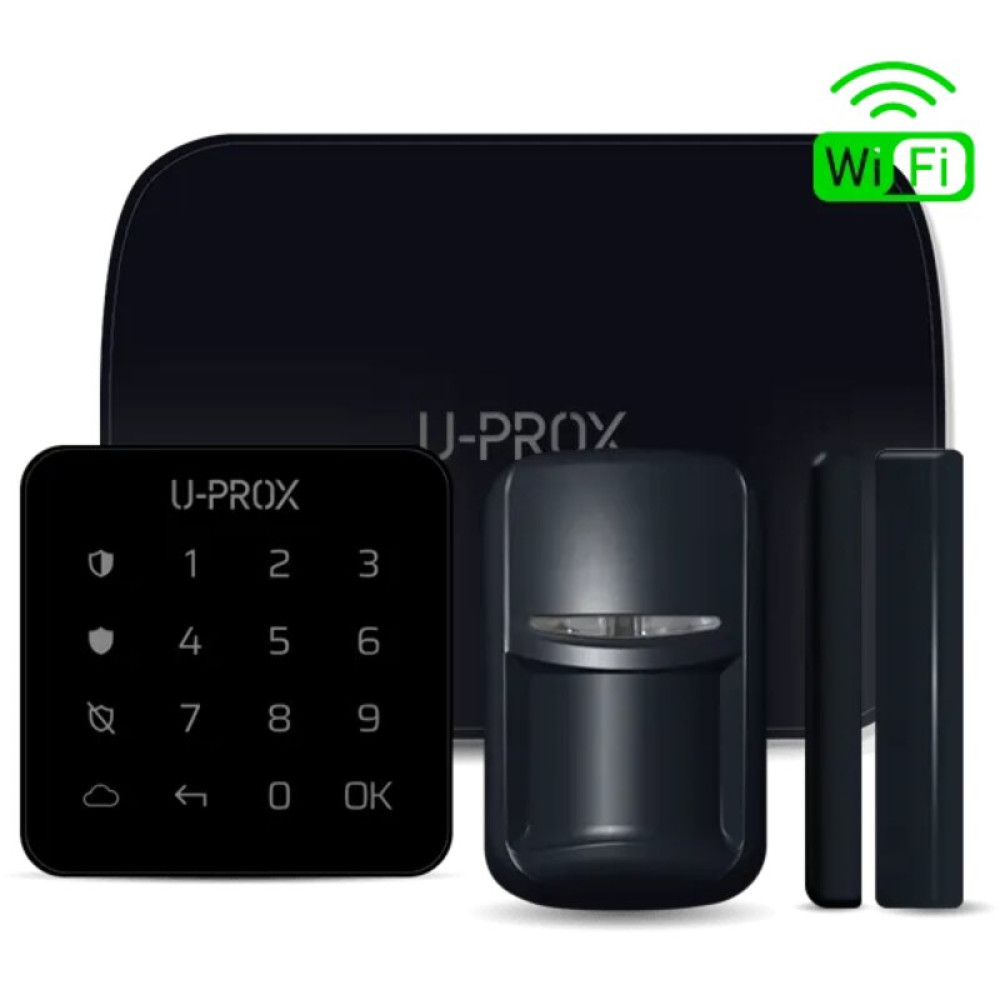 Комплект беспроводной охранной сигнализации включает: базовый блок U-Prox MP WiFi center, датчик движения U-Prox PIR, магнитоконтактный извещатель U-Prox WDC mini (с дополнительным корпусом), клавиатура U-Prox Keypad G1