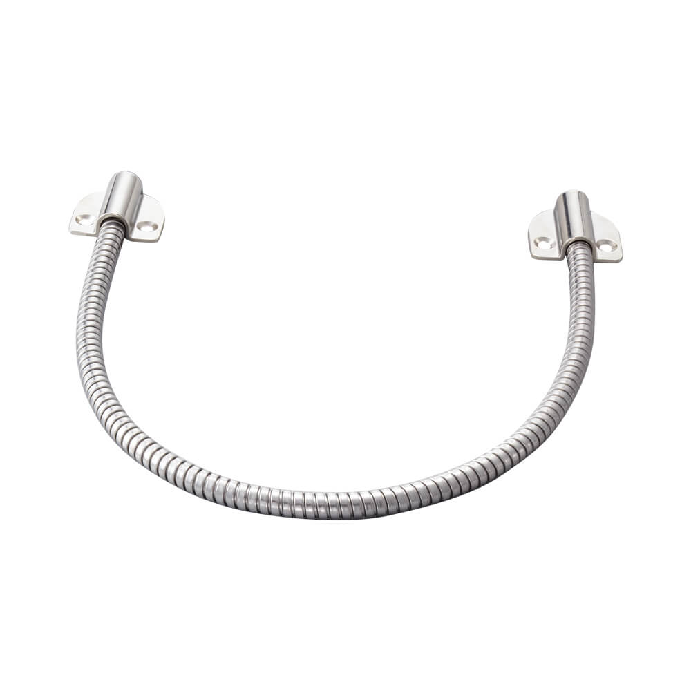 Гнучкий перехід дверний, використовується для захисту кабелю від пошкодження і деформації. Складається з гофрованої труби і кріпильних елементів. Зроблено зі сплаву металів (в основному цинк). Тип установки: вуличний / внутрішній. Загальна довжина 500мм. Розміри гофрованої труби 450х8 мм. Внутрішній діаметр 6мм. Вага 90 грам.