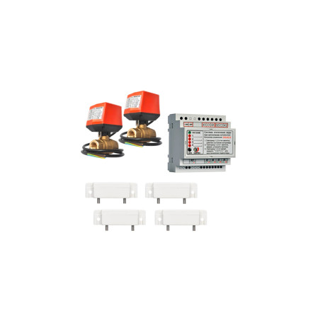 Комплект для квартири з використанням кульових кранів з електроприводами (сервомоторами): контролер управління КУА-4/4-С, 2 кульових крана з сервоприводом 632F+M6A2, 4 датчики затоплення Akvarate..