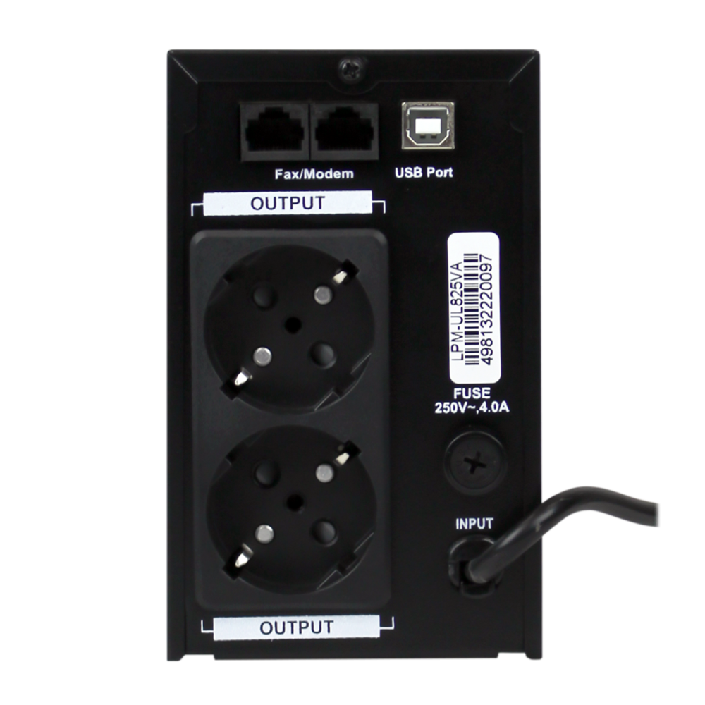 Безперебійне ДБЖ/UPS LPM-UL825VA (лінійно інтерактивний тип) має показники потужності 825/577 VA/W і вхідну напругу 145-290 V. Захисний функціонал інтерактивного джерела безперебійного живлення ДБЖ LPM-UL825VA передбачає: захист від короткого замикання, стрибків напруги, перевантаження, розряду та надмірного заряду батарей. Автозаряджання пристрою виконується у вимкненому стані. Має 2 євророзетки, функції холодного старту та повторного запуску при відновленні напруги у мережі.