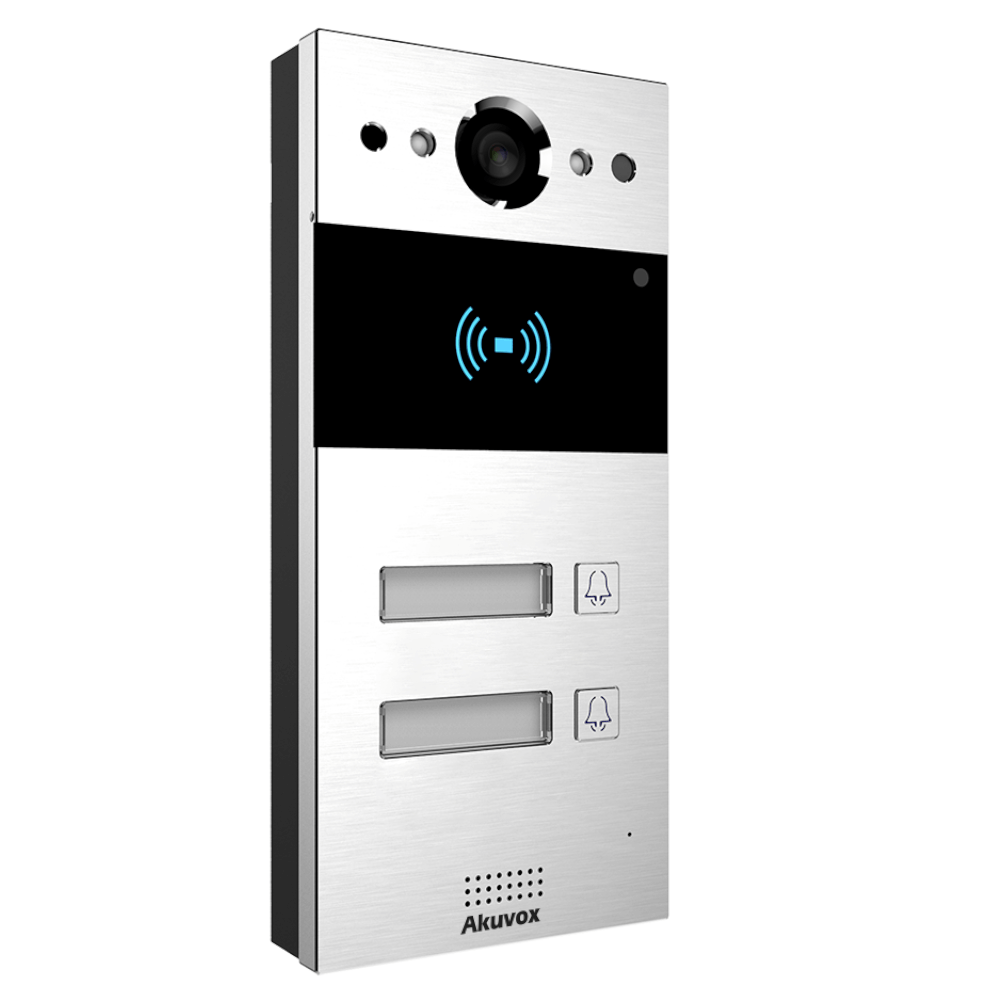 Двохабонентна SIP панель виклику з камерою та RF-зчитувачем, 2 кнопки виклику з панелями назв, Сумісність зі стандартом SIP для легкої інтеграції з будь-якою SIP АТС, Двосторонній аудіозв'язок з функцією усунення відлуння, Камера 2МП, кути огляду: 110°(гориз.) / 58°(вертик.), Зчитувач RF-карток 13.56MHZ та 125KHZ, 2 релейні виходи для відчинення дверей, Підтримка PoE (IEEE802.3af), Матеріал корпусу: алюміній, Клас захисту IP65, Настінний монтаж