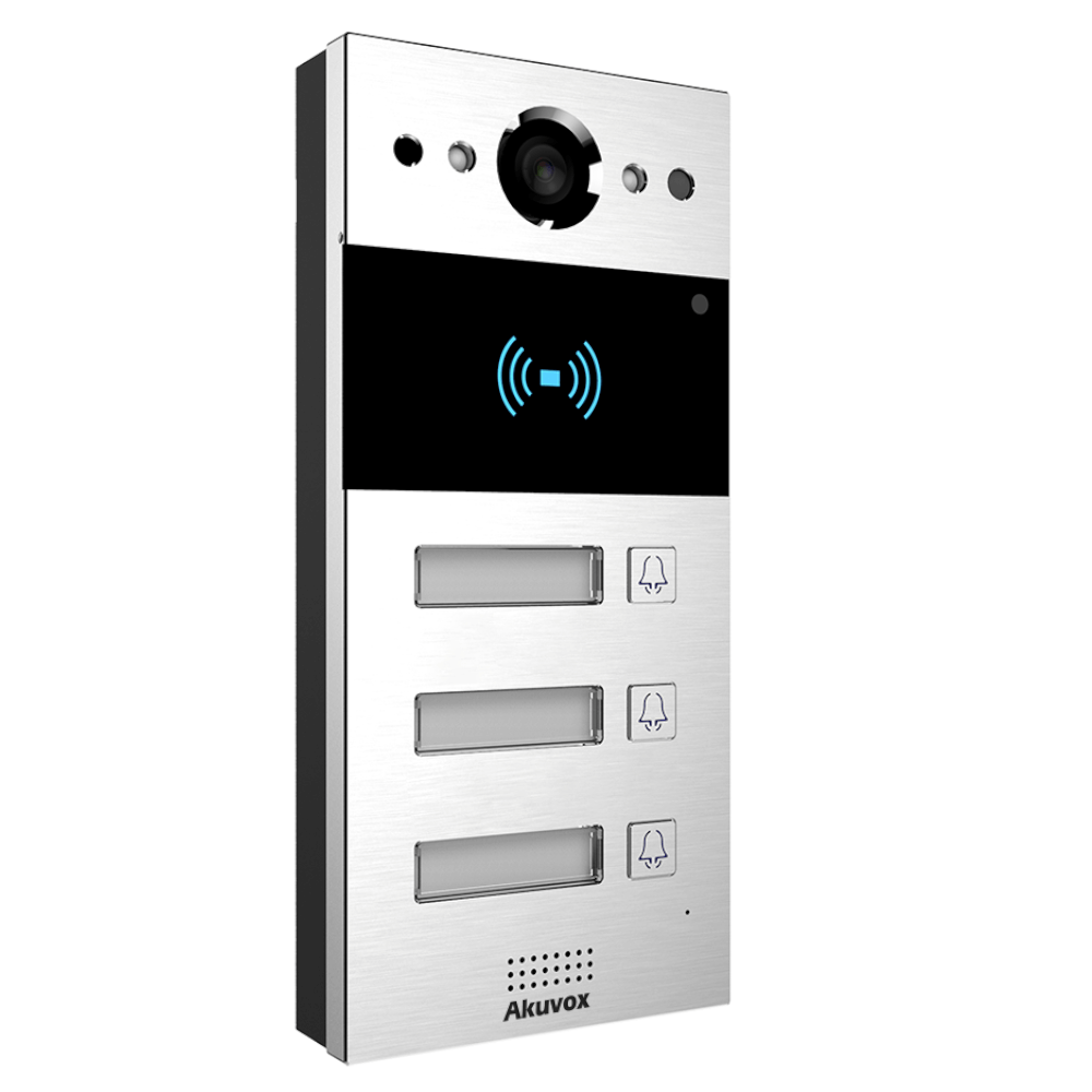 Трьохабонентна SIP панель виклику з камерою та RF-зчитувачем, 3 кнопки виклику з панелями назв, Сумісність зі стандартом SIP для легкої інтеграції з будь-якою SIP АТС, Двосторонній аудіозв'язок з функцією усунення відлуння, Камера 2МП, кути огляду: 110°(гориз.) / 58°(вертик.), Зчитувач RF-карток 13.56MHZ та 125KHZ, 2 релейні виходи для відчинення дверей, Підтримка PoE (IEEE802.3af), Матеріал корпусу: алюміній, Клас захисту IP65, Настінний монтаж